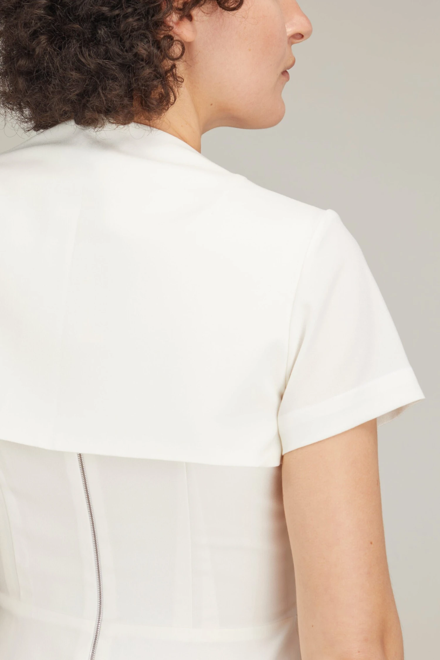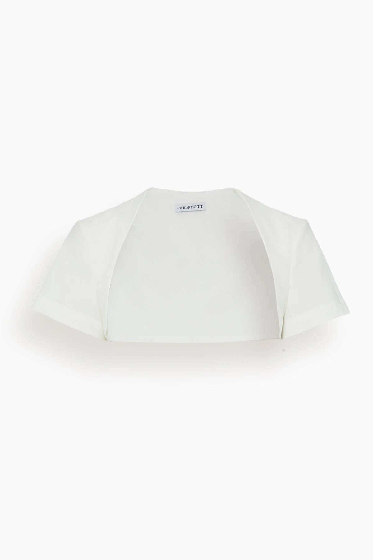 The E. Stott Bev Addition in Ivory is a short sleeve shawl jacket to be worn with the Susannah Dress or easily paired with another outfit.