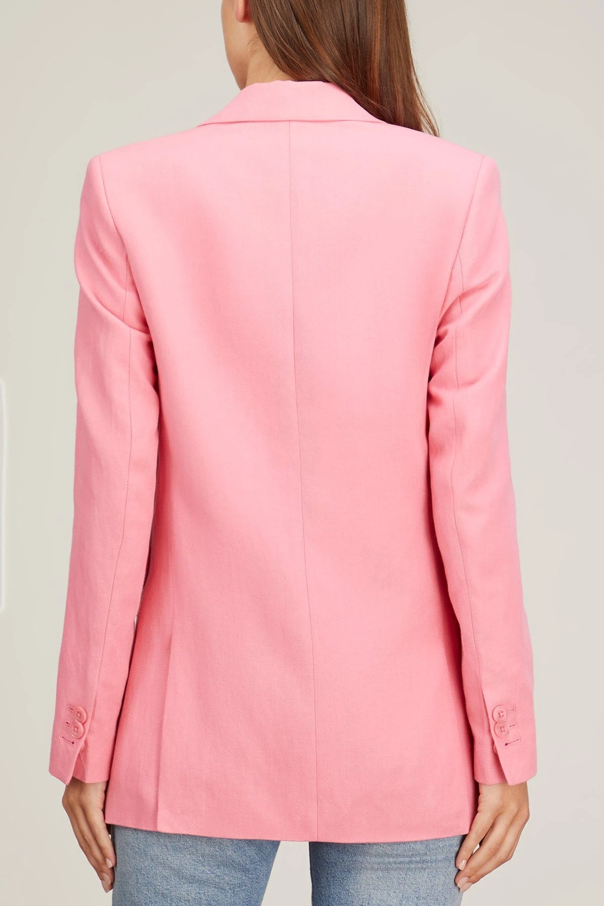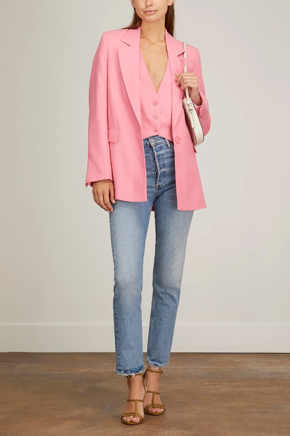 The lightweight blazer is crafted in a cooling mix of cotton and linen, and comes together with a single button closure. The style has a slight A-line drape, which makes it ideal for wearing open.