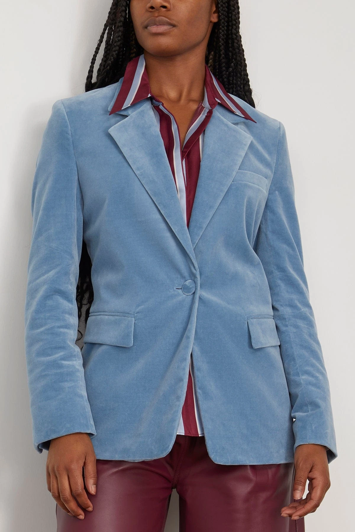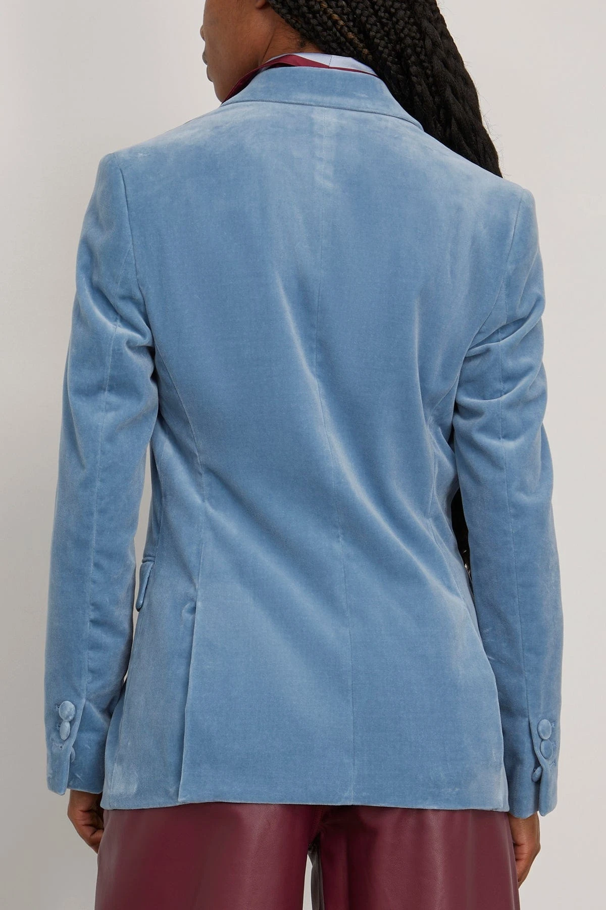 The blazer is made of soft velvet. It has a slim silhouette and comes in a tailored fit. Style the blazer with the matching velvet pants to create a suit.