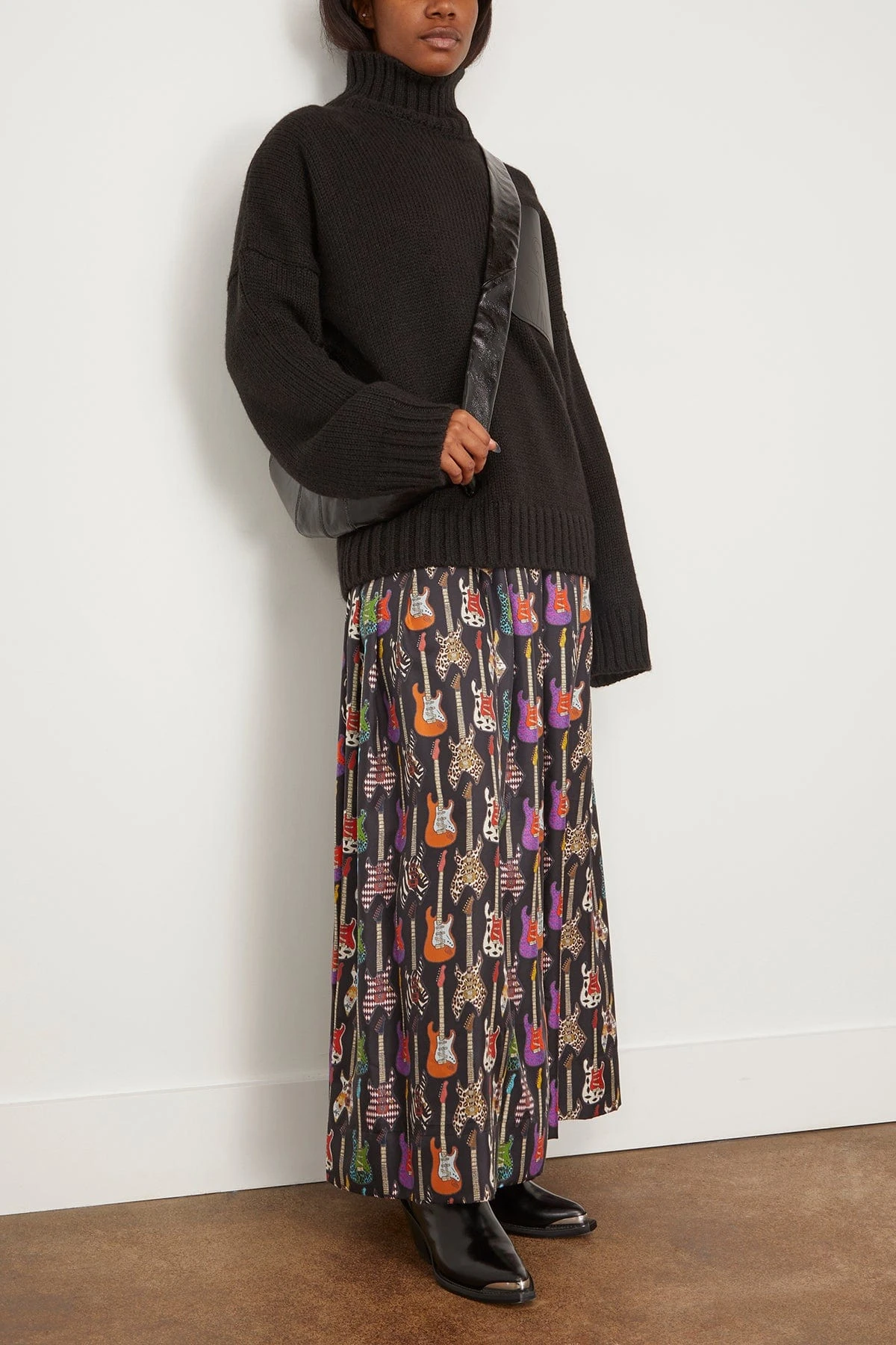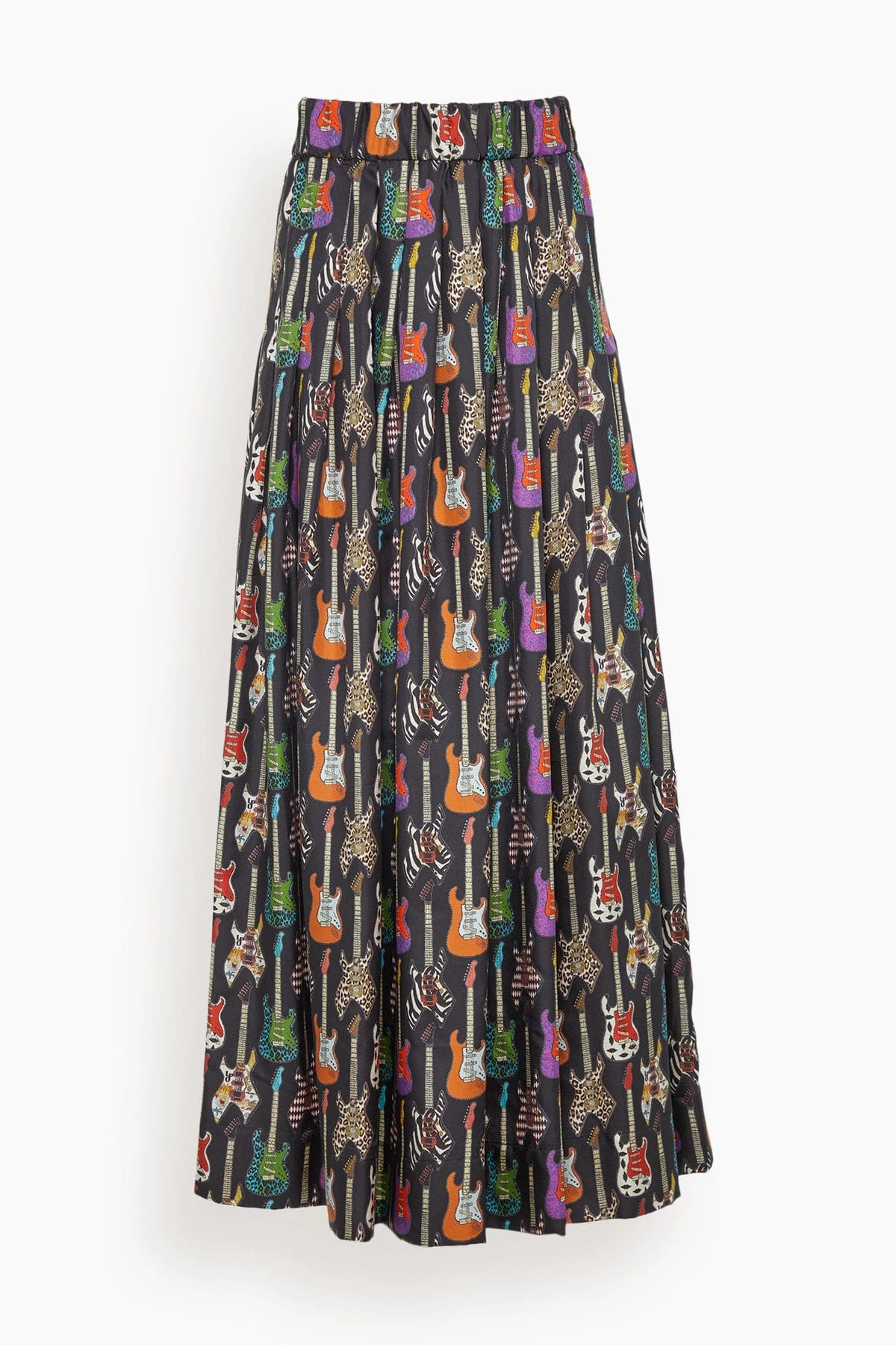 The La Prestic Ouiston Florence Skirt will be a playful addition to your wardrobe. This skirt features a classic a-line silhouette with a music inspired guitar print. Wear yours with a sweater and boots.