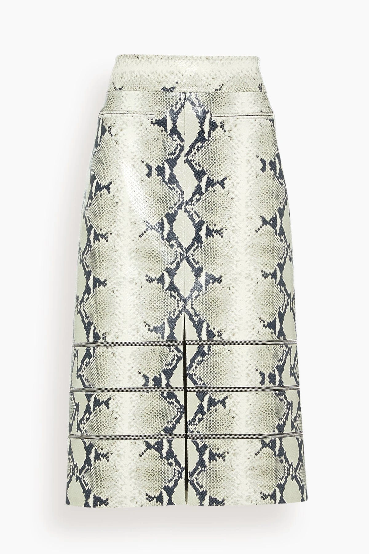 The Khaite Isla Skirt in Natural is a leather skirt with front slit and embossed python-printed design.