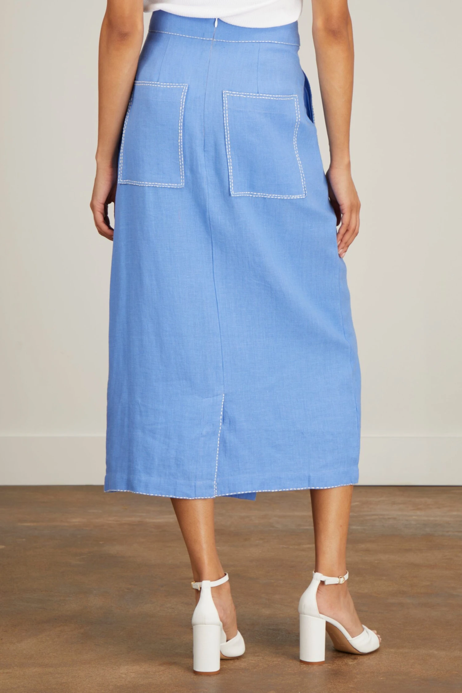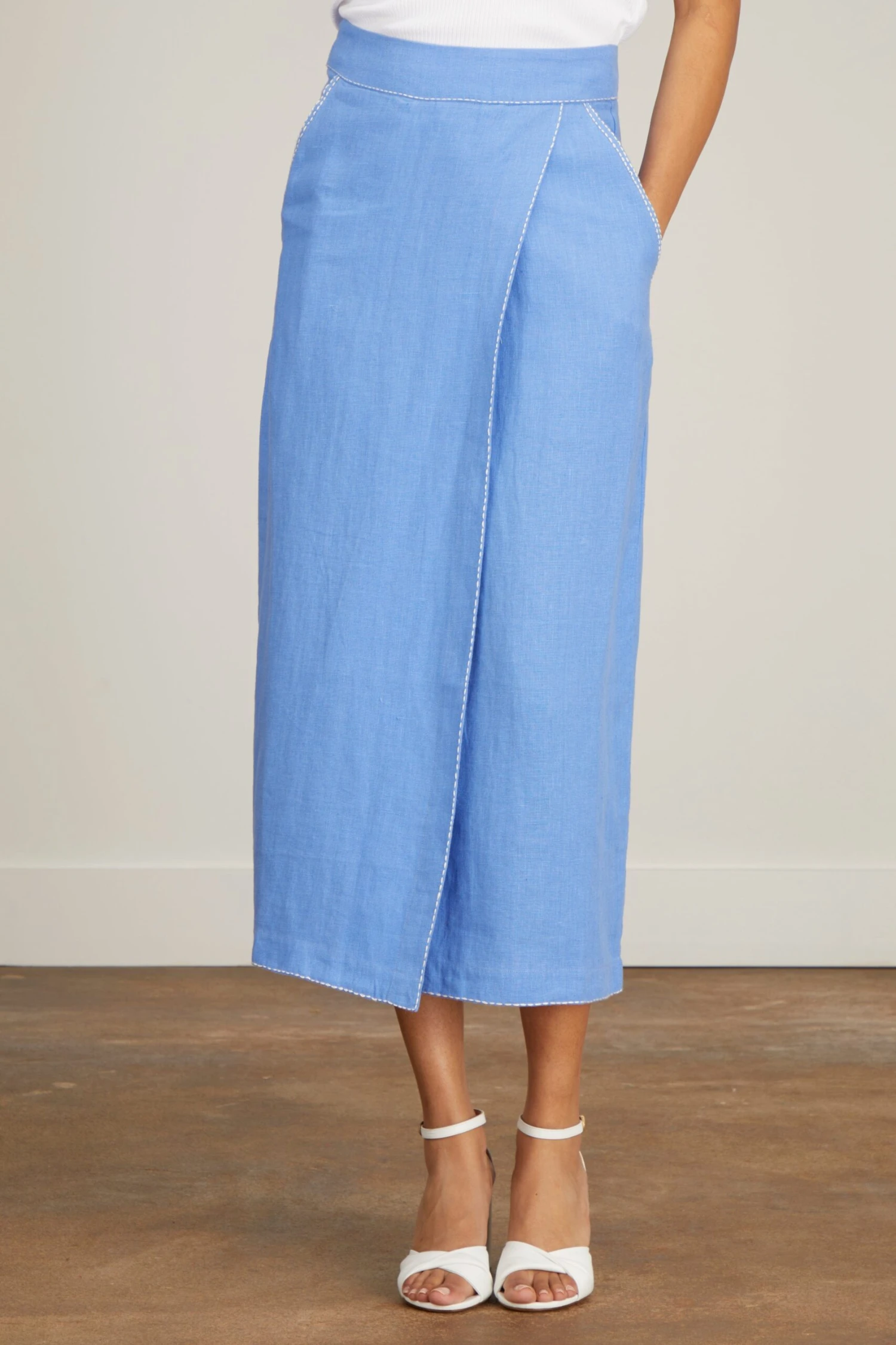 The Mii Linen Hand Embroidered Skirt is a piece you’ll have for years to come. This midi skirt features a wrap front with delicate embroidery. Wear yours with a blouse tucked in.
