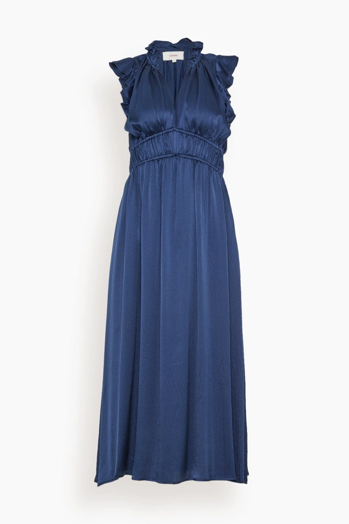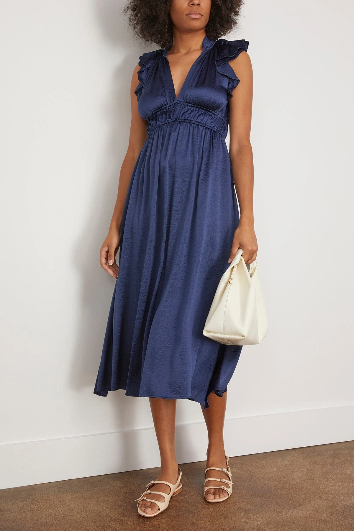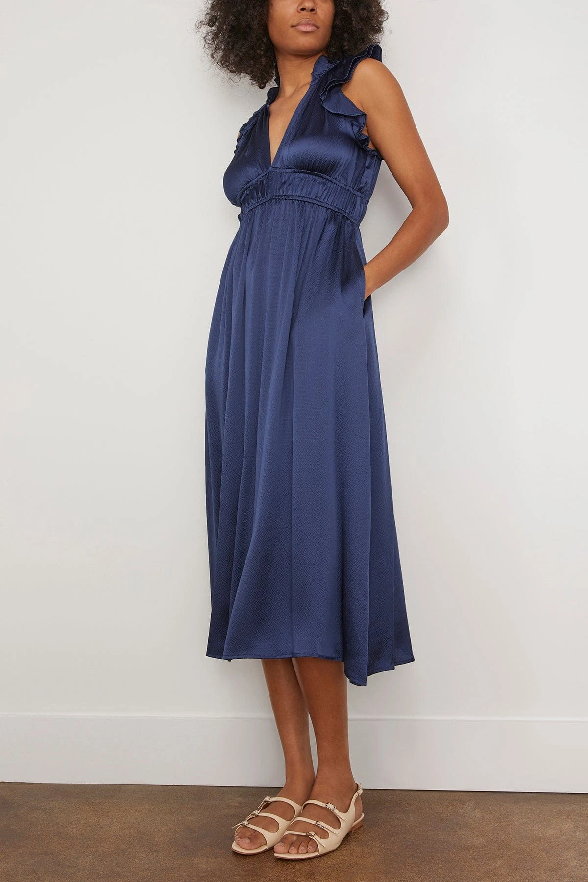 The Xirena Posey Dress is a must-have piece from their Fall 23 Collection. This hammered silk dress features a beautiful ruffled neckline with a deep v-neckline and gathered waist. Wear yours with boots and a shoulder bag.