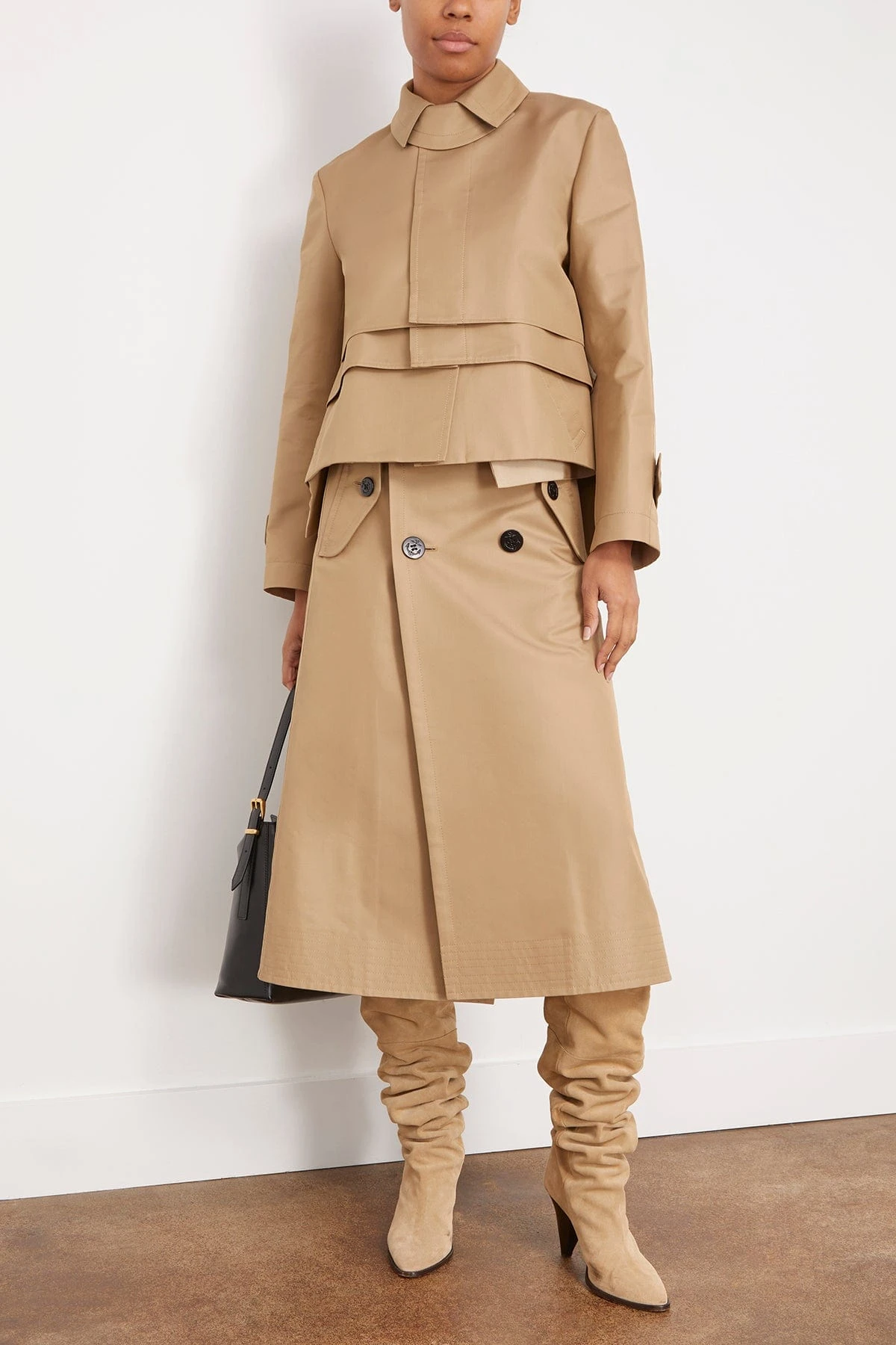 The Sacai Cotton Gabardine Blouson in Beige features a layered tiered design with concealed front button closure and cropped length. This piece features alayered blouson silhouette and is designed with archetypal trench details for a hybrid look.