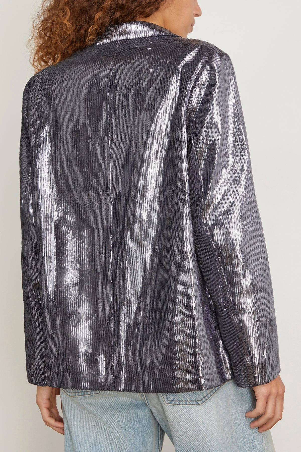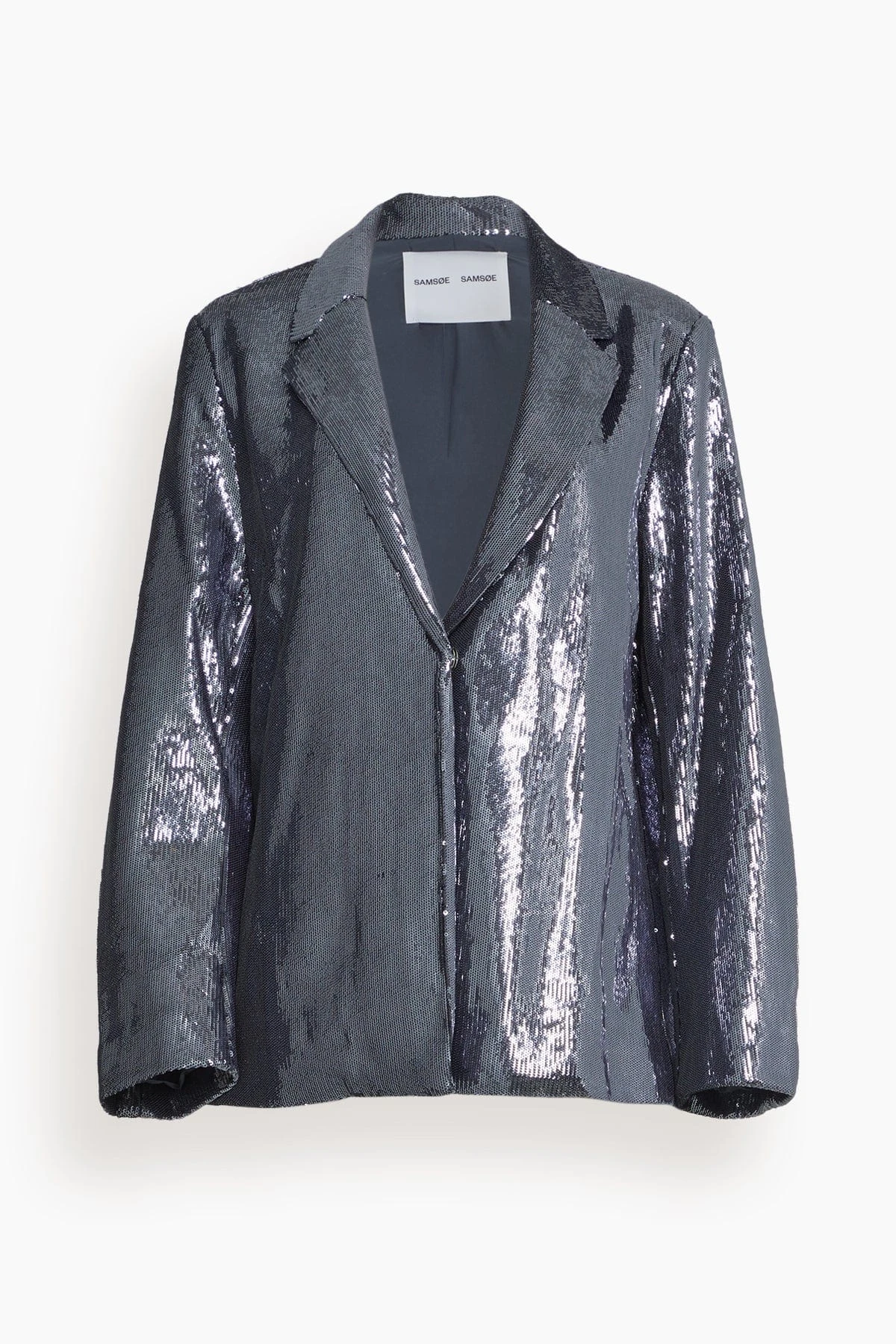 The Samsoe Samsoe Raven Blazer in Turbulence is a single breasted sequined blazer with a regular fit. Press-button fastening, notched lapel collar, inside pocket. Lined. Sparkling micro-sequin fabric, recycled polyester blend.
