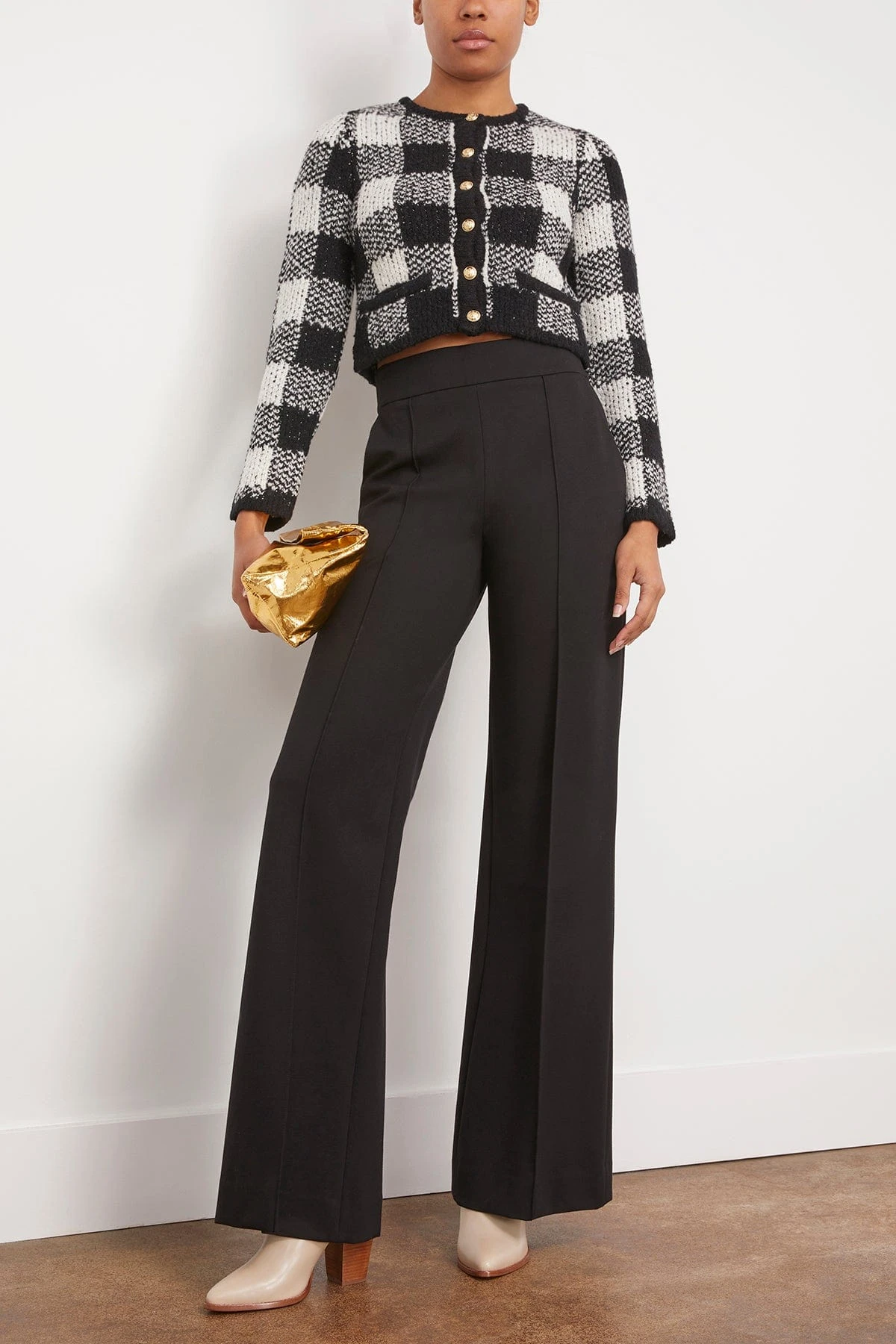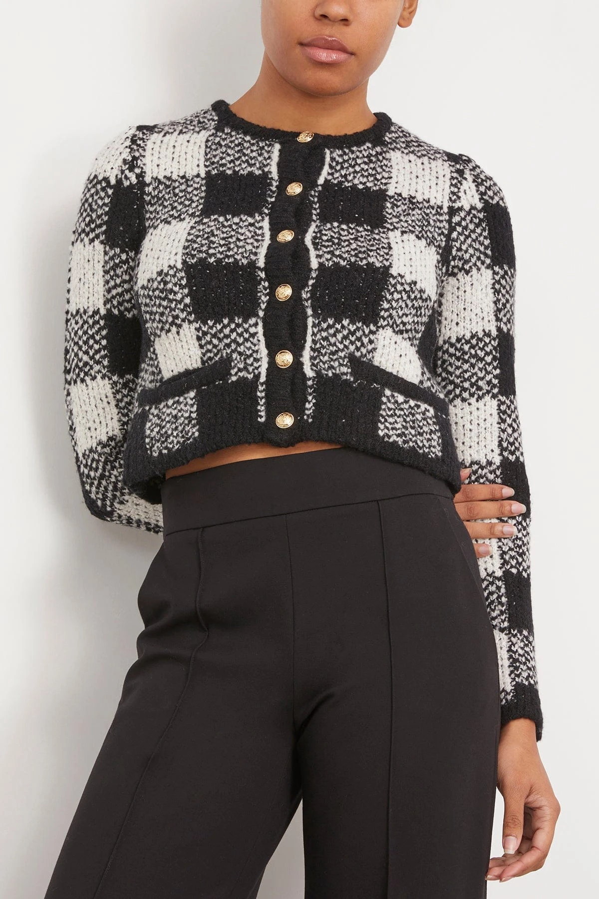 The Sea NY Chiyo Check Knit Long Sleeve Button Down Cardigan features a cropped silhouette and ornate gold button front detailing. We love this timeless cardigan buttoned up and with jeans.