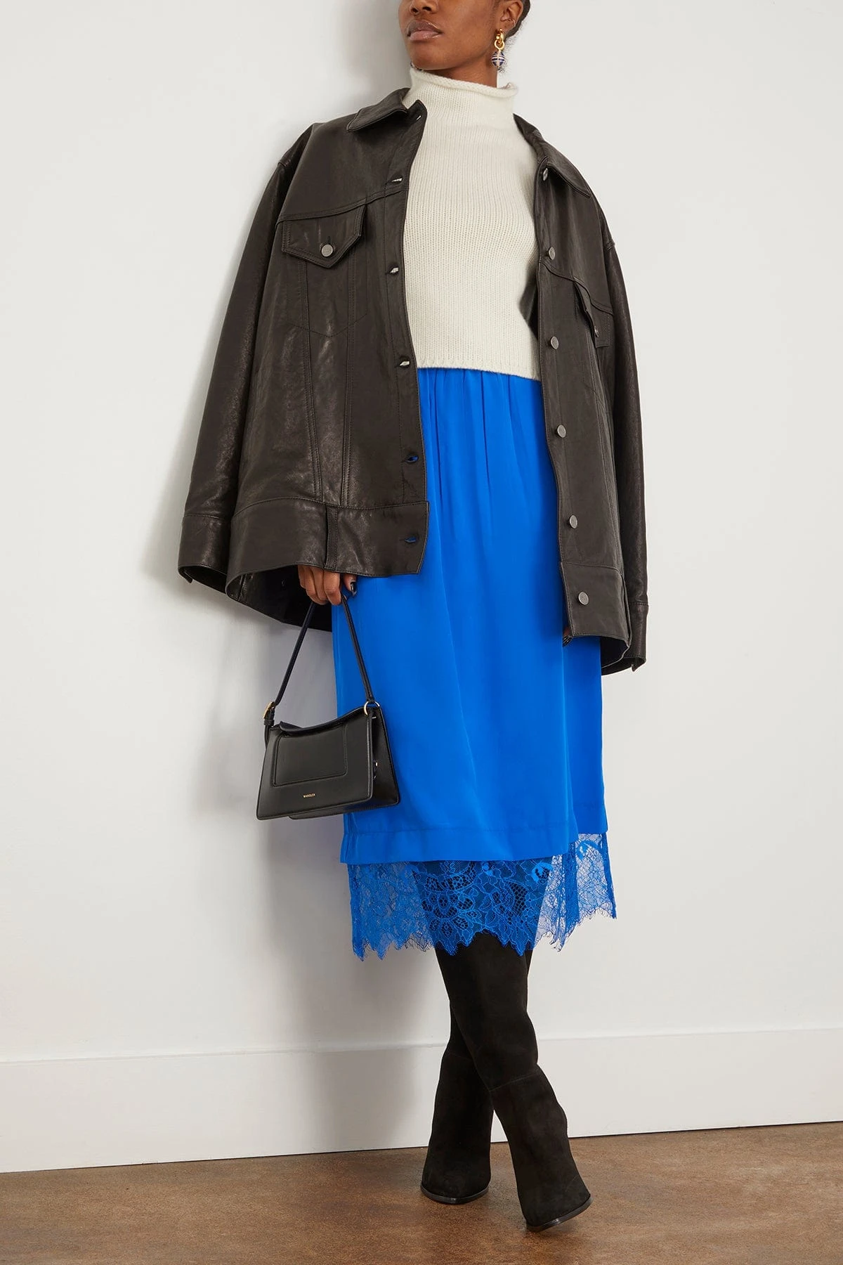 The SEA Lorraine Lace Combo Slip Skirt is a classic with a twist. This slip skirt features a straight silhouette with a feminine lace hemline. Wear yours with a sweater and boots.