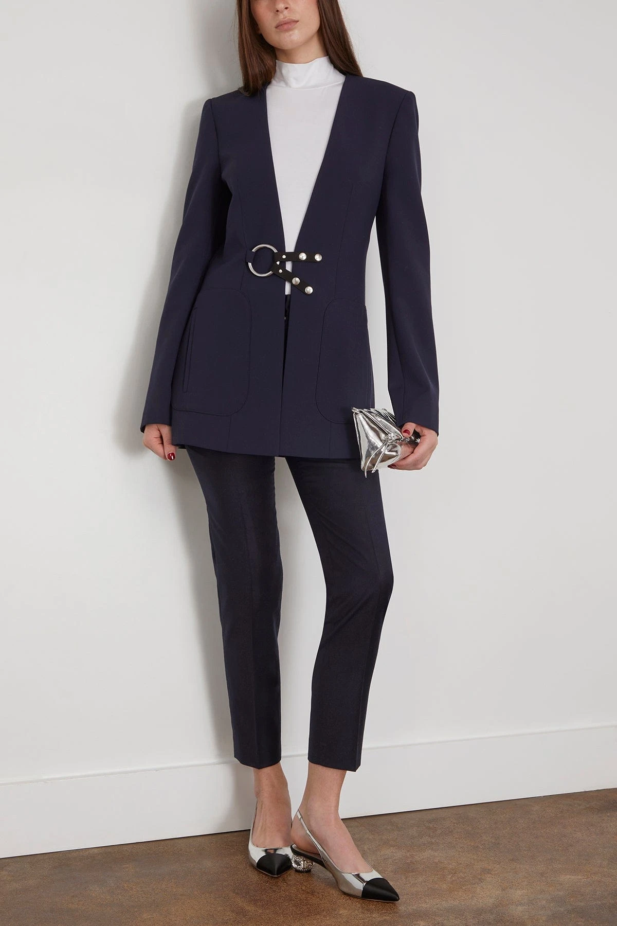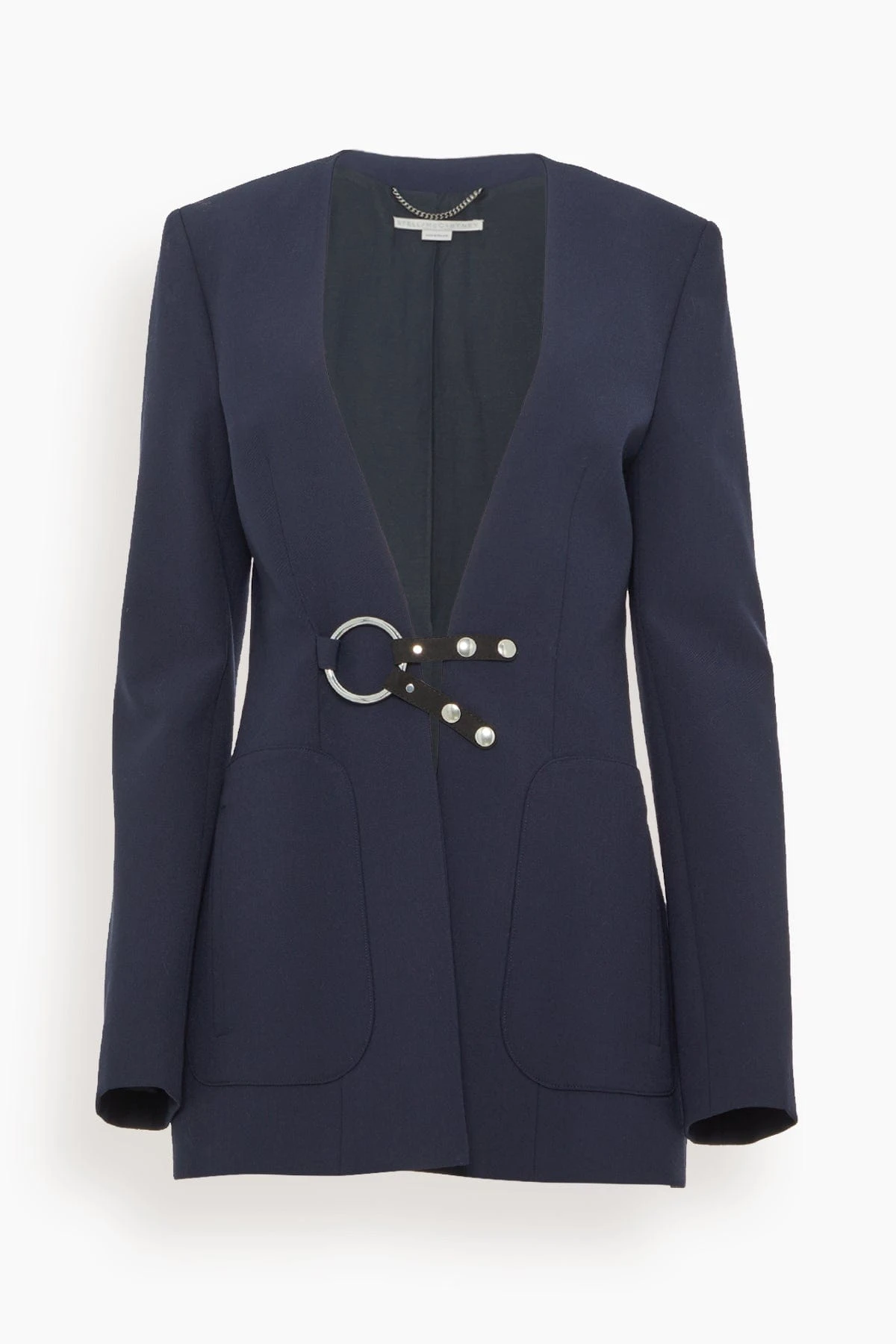 The Stella McCartney Jacket in Ink is a tailored blazer with equestrian inspired ring and snap button front closure.