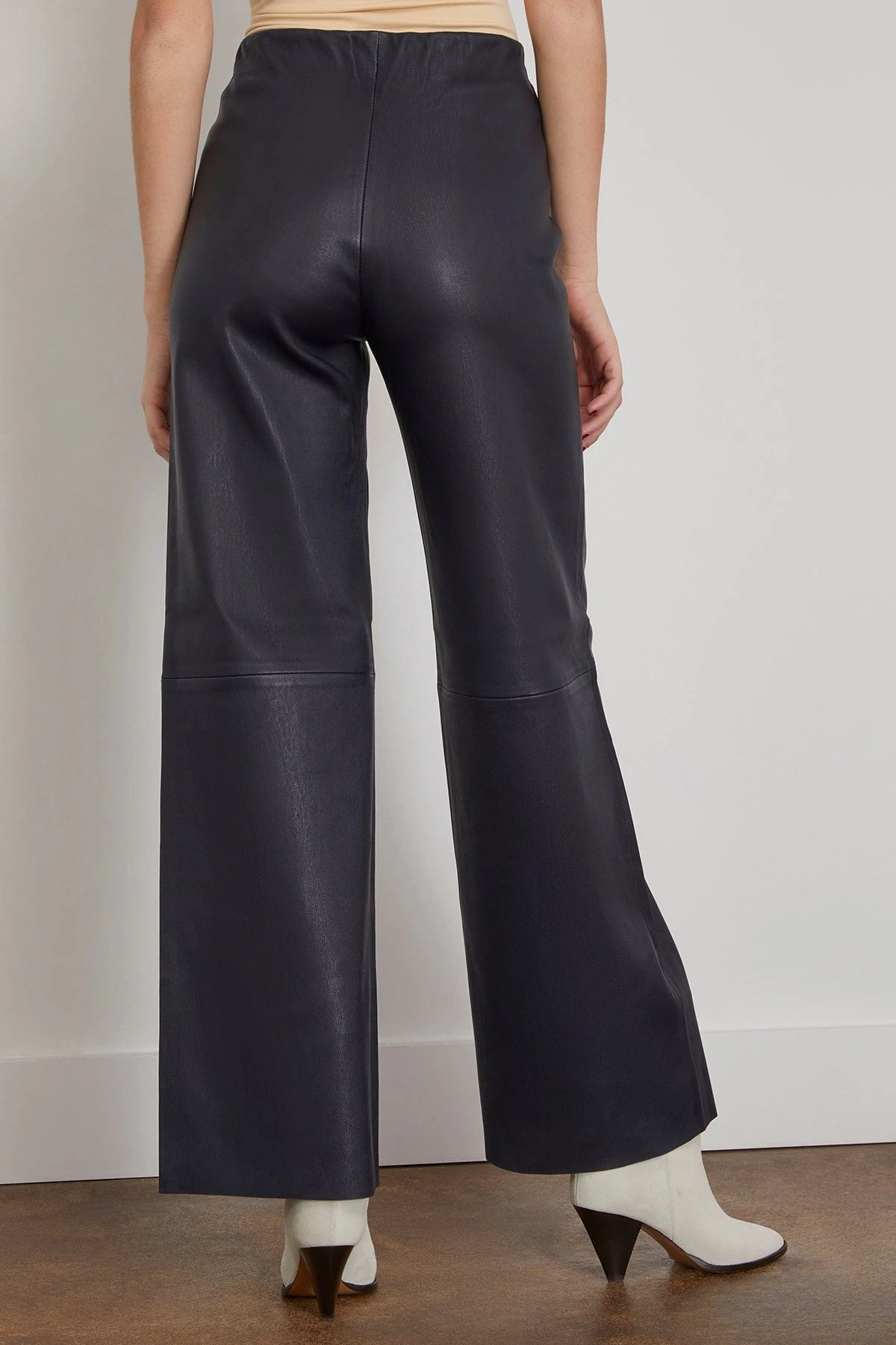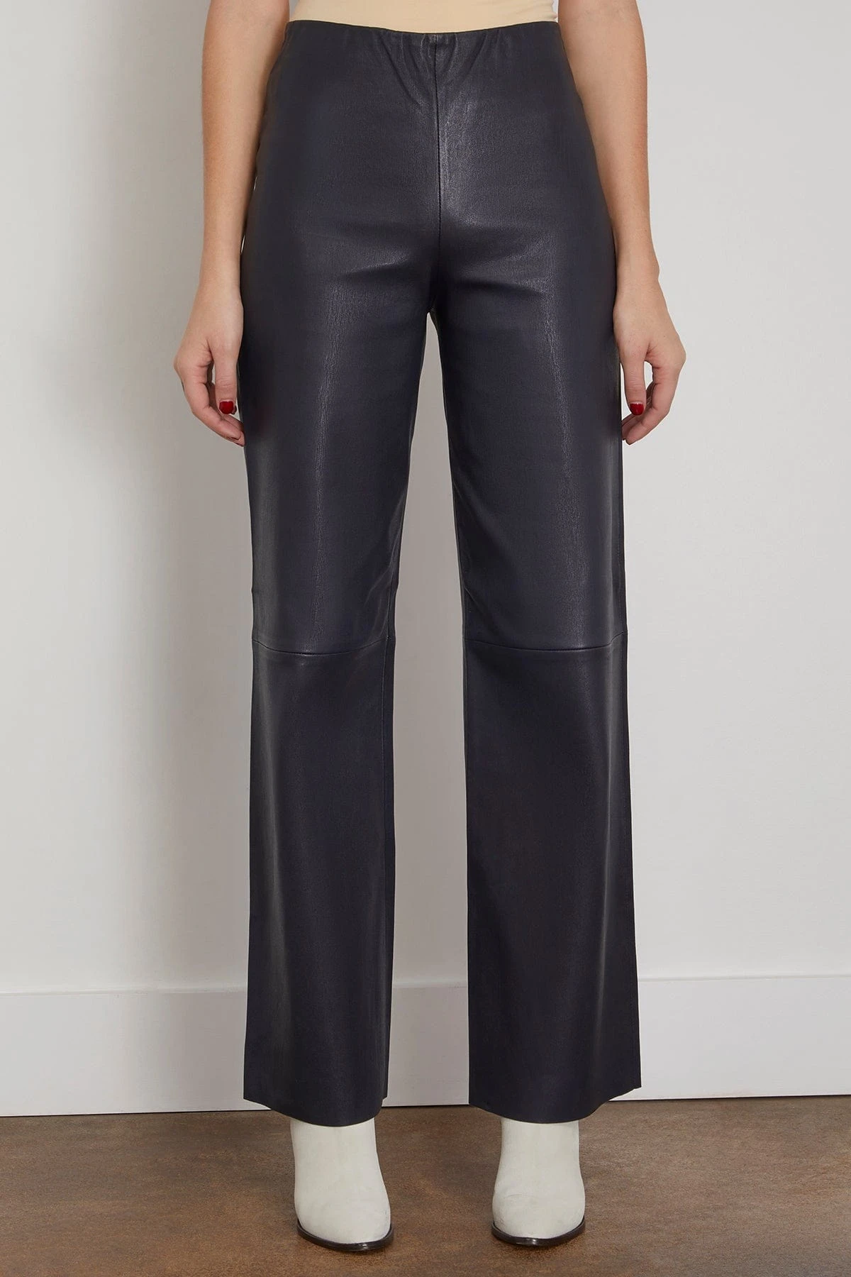 The Odeeh Stretch Nappa Pants in Black/Blue are leather pants with elastic waistband, shortened length, and slightly flared leg.