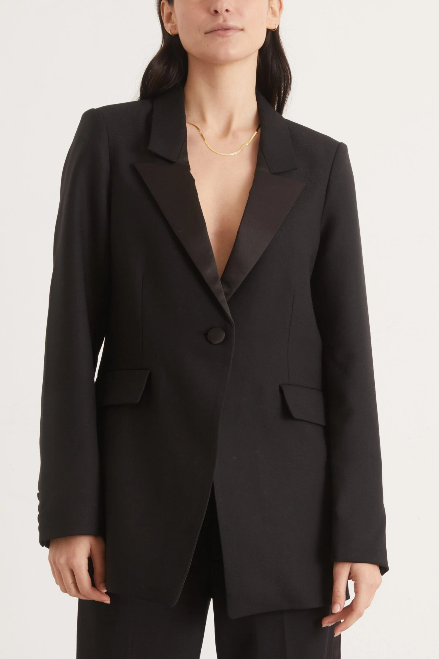 The Co Tuxedo Blazer will be an instant classic in your wardrobe. This blazer features a tuxedo style with a single button closure, straight silhouette, and notched lapel. Wear yours with the matching tuxedo pants for a chic look.